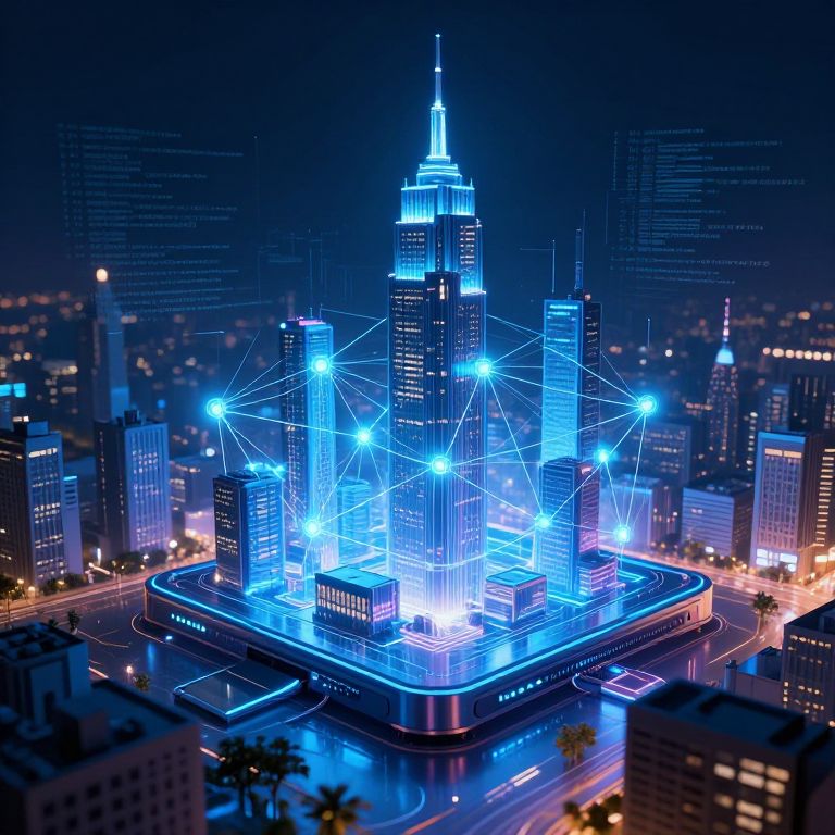 This is a digital CGI image depicting a futuristic, neon-lit cityscape at night. The central focus is a skyscraper with a glowing blue geometric lattice structure, illuminated by bright blue lights, creating a network of lines and points. The building stands on a square base with additional blue-lit structures around it. Surrounding buildings are dark with occasional lit windows, set against a deep blue and black sky. The cityscape includes blurred lights from streets and other buildings. The overall style is highly stylized and futuristic, with a vibrant, cyberpunk aesthetic.