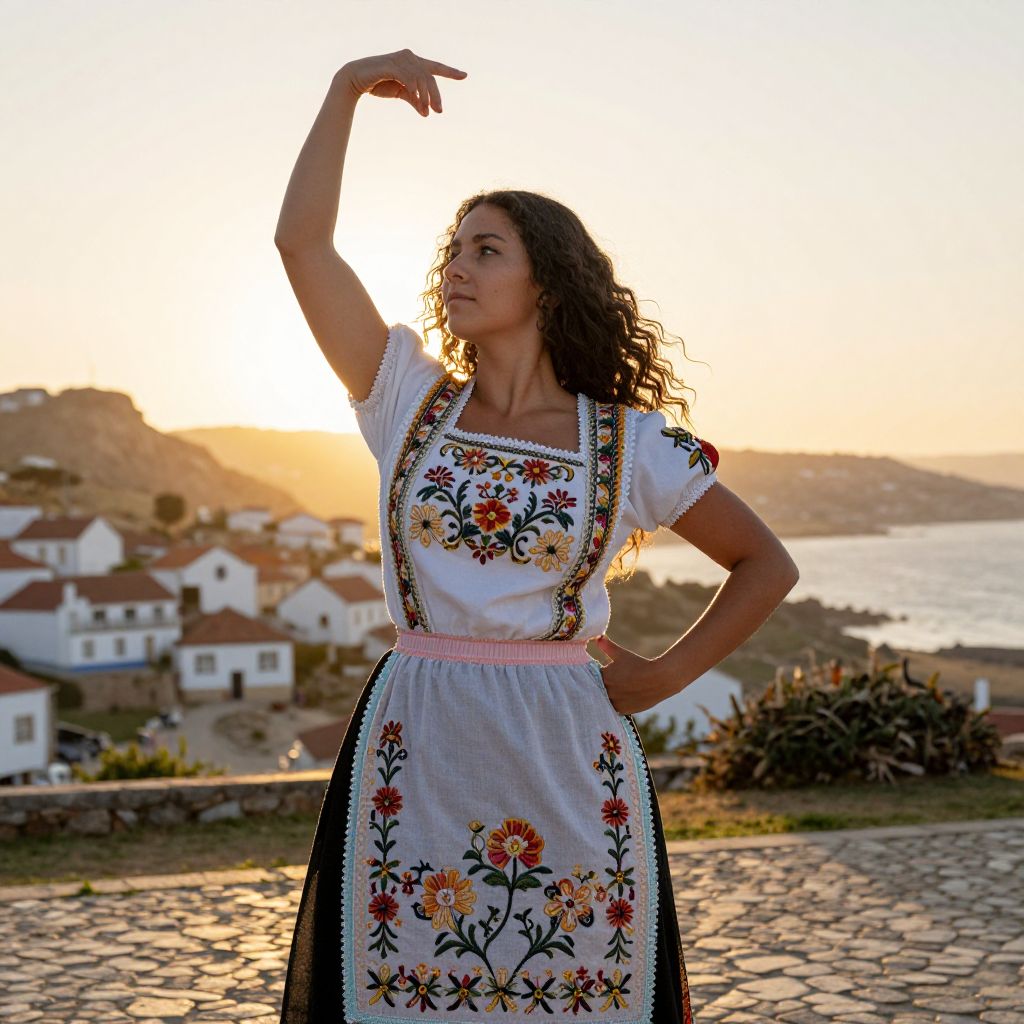 A beautifully lit outdoor scene showing a young woman with soft, olive-toned skin and dark, wavy hair flowing over her shoulders, performing a folk dance in a traditional Portuguese village, wearing a hand-embroidered apron with detailed floral patterns in pastel hues, under a golden sunrise over the coastal hills. The woman has big tits and cute face