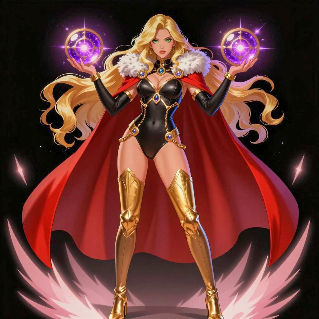 Digital illustration of a blonde woman with long wavy hair, green eyes, and a confident expression. She wears a black, skin-tight bodysuit with gold accents, a red cape with a white fur collar, and gold thigh-high boots. She stands with her legs together, arms raised, holding two glowing, purple and gold magical orbs. Her outfit is adorned with gold chains and arm guards. The background is black, and the base has pink, wing-like designs. The woman's skin is fair, and she is centered in the image.