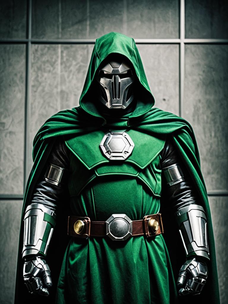Man in Doctor Doom Costume, photorealistic villain cosplay portrait, cinematic realism