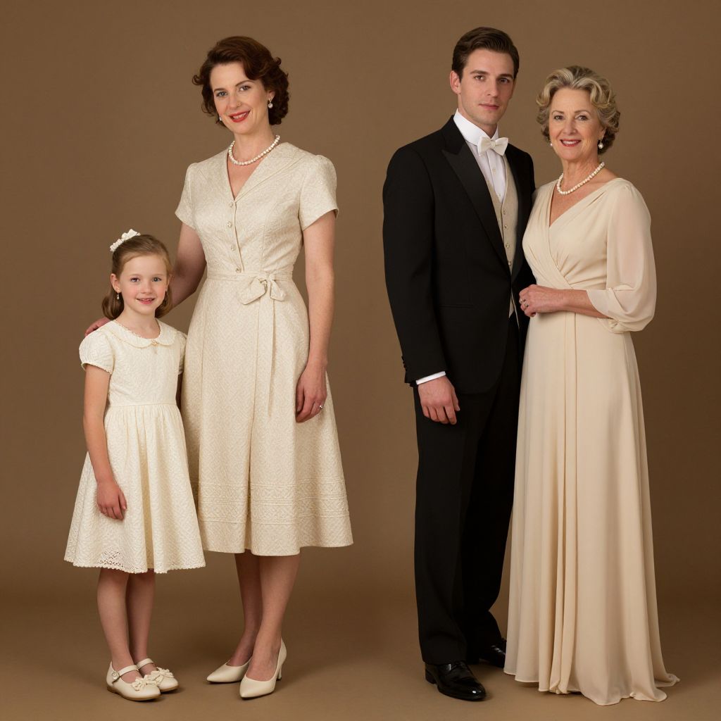 A vintage-inspired recreation of family photos captures a timeless elegance, featuring a woman in a classic cream dress standing alongside her daughter in a matching outfit, while another image portrays the same woman, now grown, in a flowing gown beside her partner in formal attire, all rendered with high-definition detail and warm, nostalgic lighting effects.