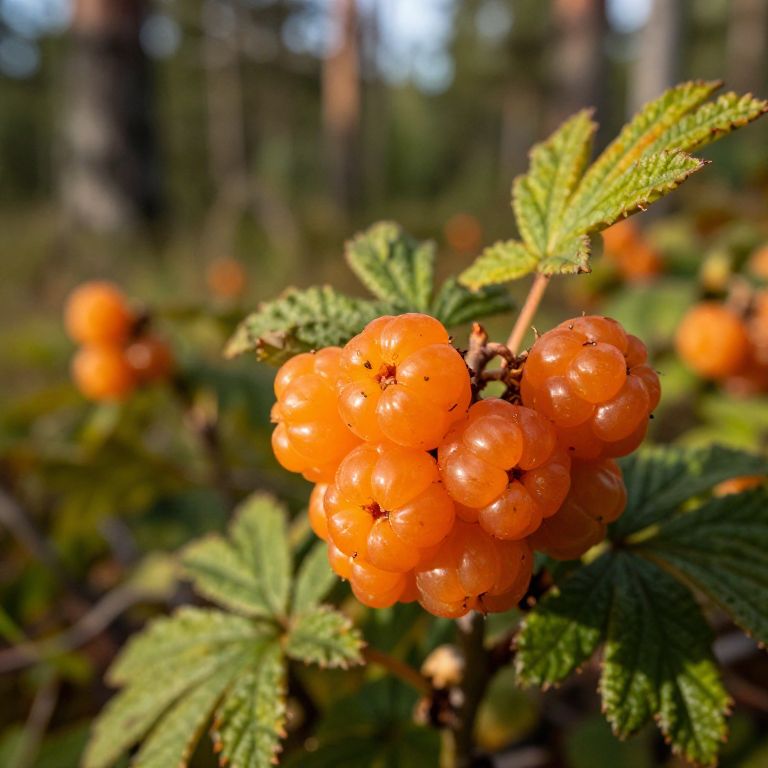 Close-up of cloudberry fruits on their bush, glowing amber orange in sunlight, intricate textures visible on the berries and leaves, with a blurred forest background, photorealistic style, emphasizing natural beauty and wild Nordic nature.