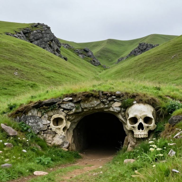 A cave entrance shaped like a skull, with rolling green hills and rocky outcrops in the background.