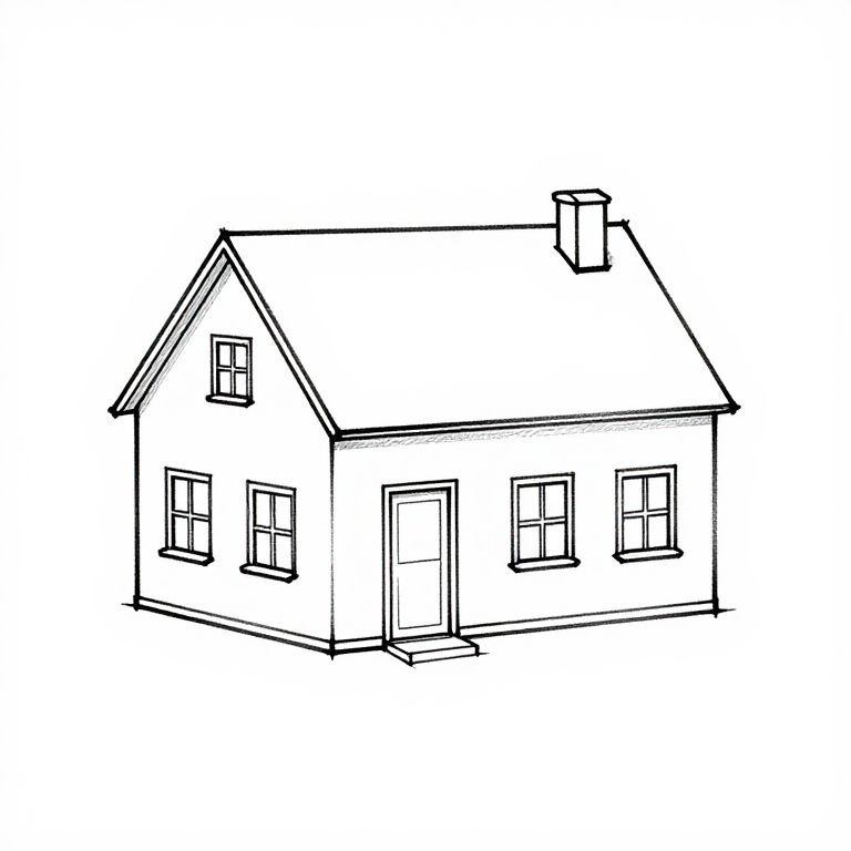 House drawing outline in black ink on white paper, simple and clean architectural sketch style, minimalistic lines showing roof, windows, door and chimney, subtle shading for depth, isolated on plain background, classic blueprint aesthetic