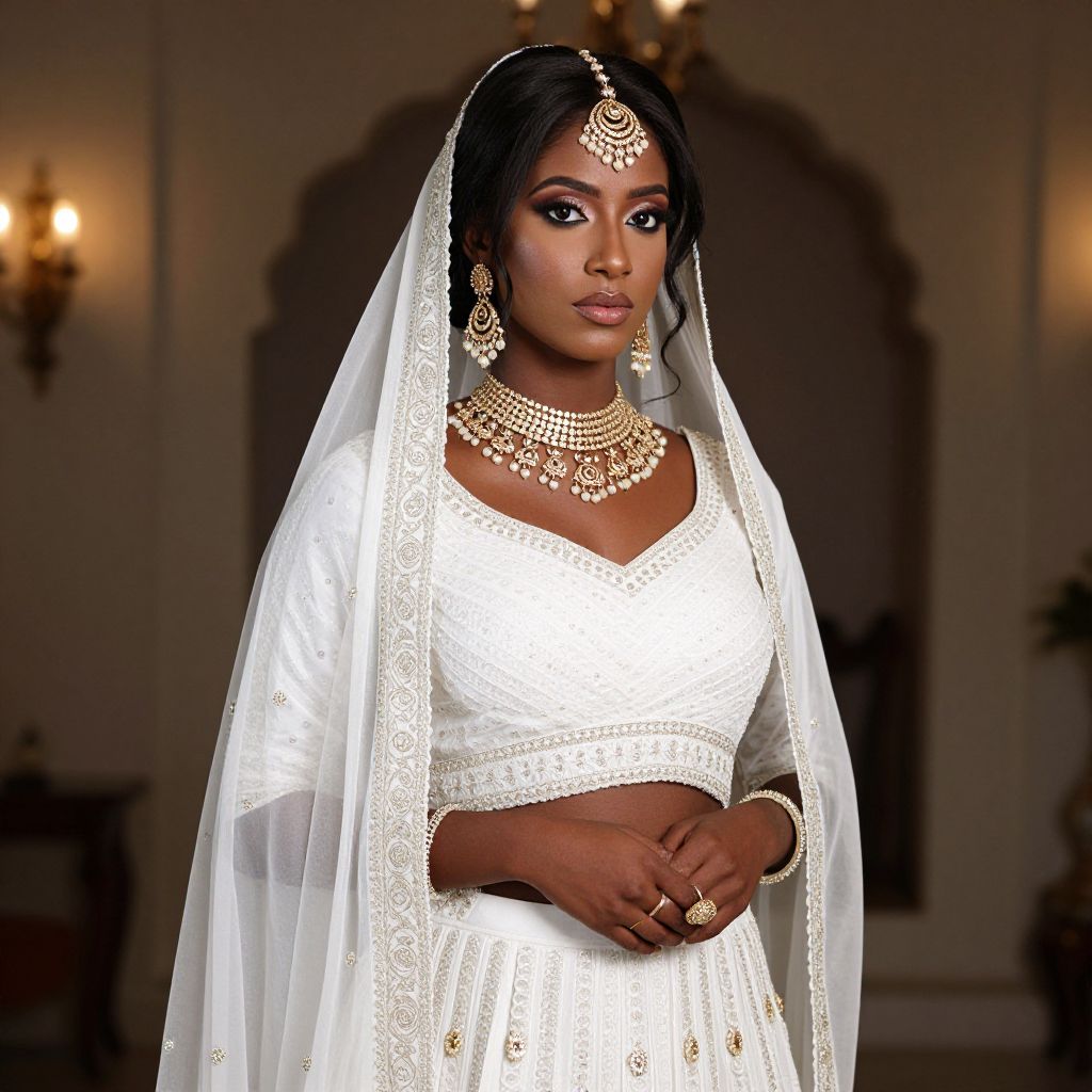 Elegant Dark-Skinned Bride in White Lehenga