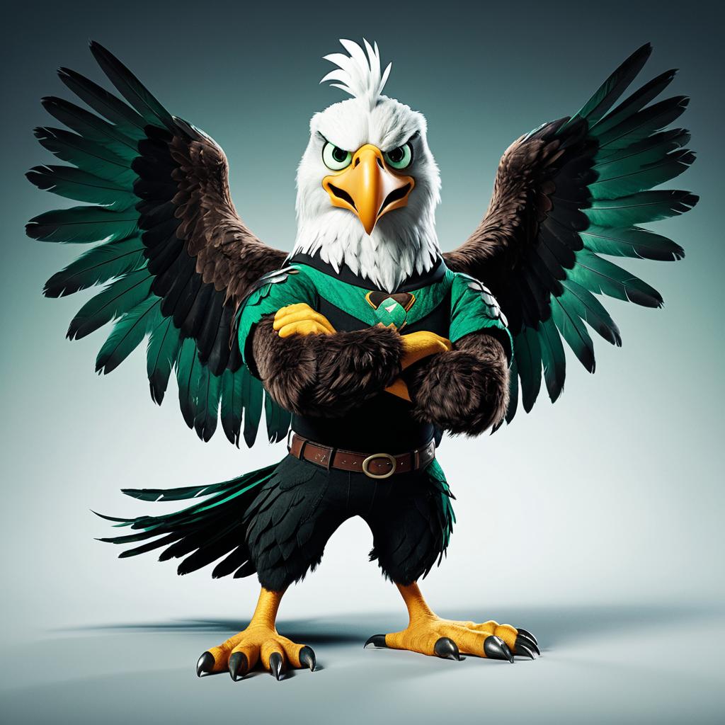 Disney Pixar character, 3D render style, eagle mascot with black and emerald green feathers, baring talons in aggressive stance, humanoid, cinematic colors