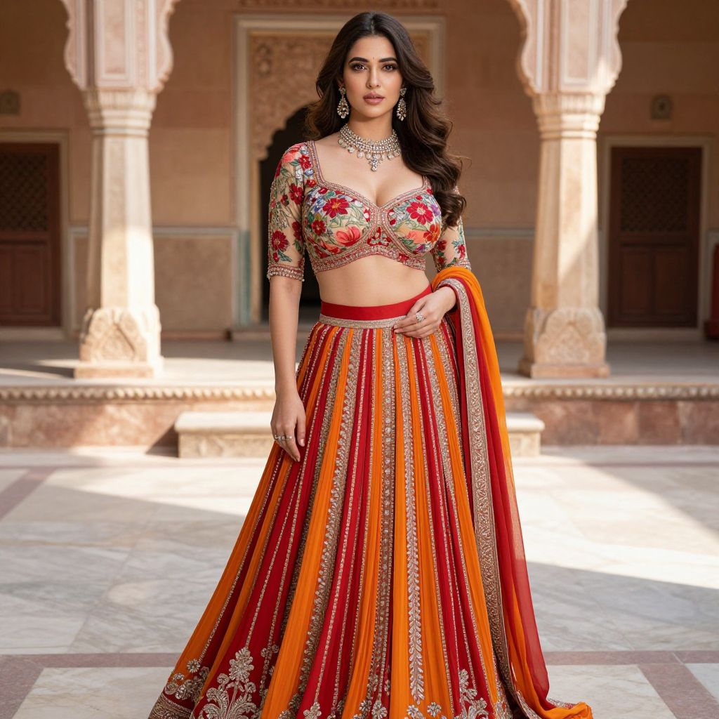 A photorealistic image of a graceful woman in a luxurious ghagra lacha costume, dressed in a red and orange striped ghagra with intricate silver zari work, paired with a floral embroidered blouse, posing in front of a traditional haveli in Jaipur with stone walls, marble flooring, and sun-dappled courtyard lighting; her face has soft features, fair skin, and delicate makeup.. The woman has big breasts and cute face