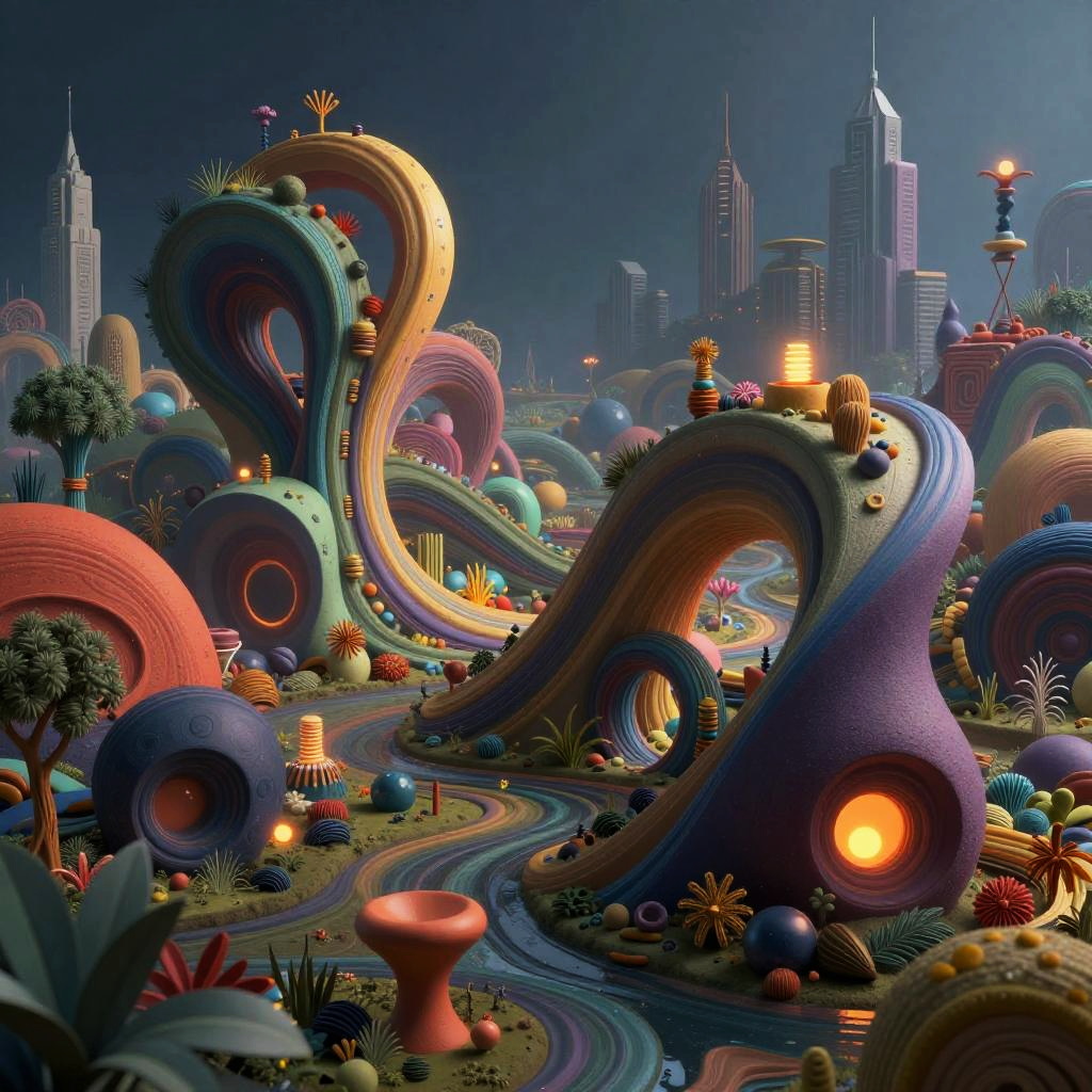 Cac themed surreal landscape featuring intertwined abstract shapes and vibrant colors, mysterious atmosphere, glowing light sources, dynamic composition, futuristic cityscape in the background, detailed textures, digital art style