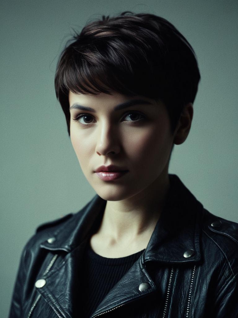 Woman with Dark Brown Pixie Cut, cinematic realism, stylish dramatic portrait