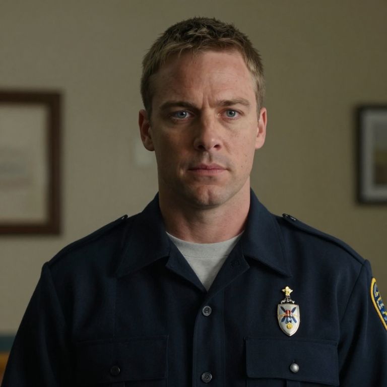 Photograph of a Caucasian male police officer with short, light brown hair and blue eyes, standing indoors. He wears a dark navy blue uniform with a white t-shirt underneath, adorned with a police badge on the left chest and a department patch on the right shoulder. The background is blurred but shows beige walls with framed pictures. The officer's expression is serious and focused, with slight shadows on his face. The lighting is soft, highlighting his facial features and uniform details.