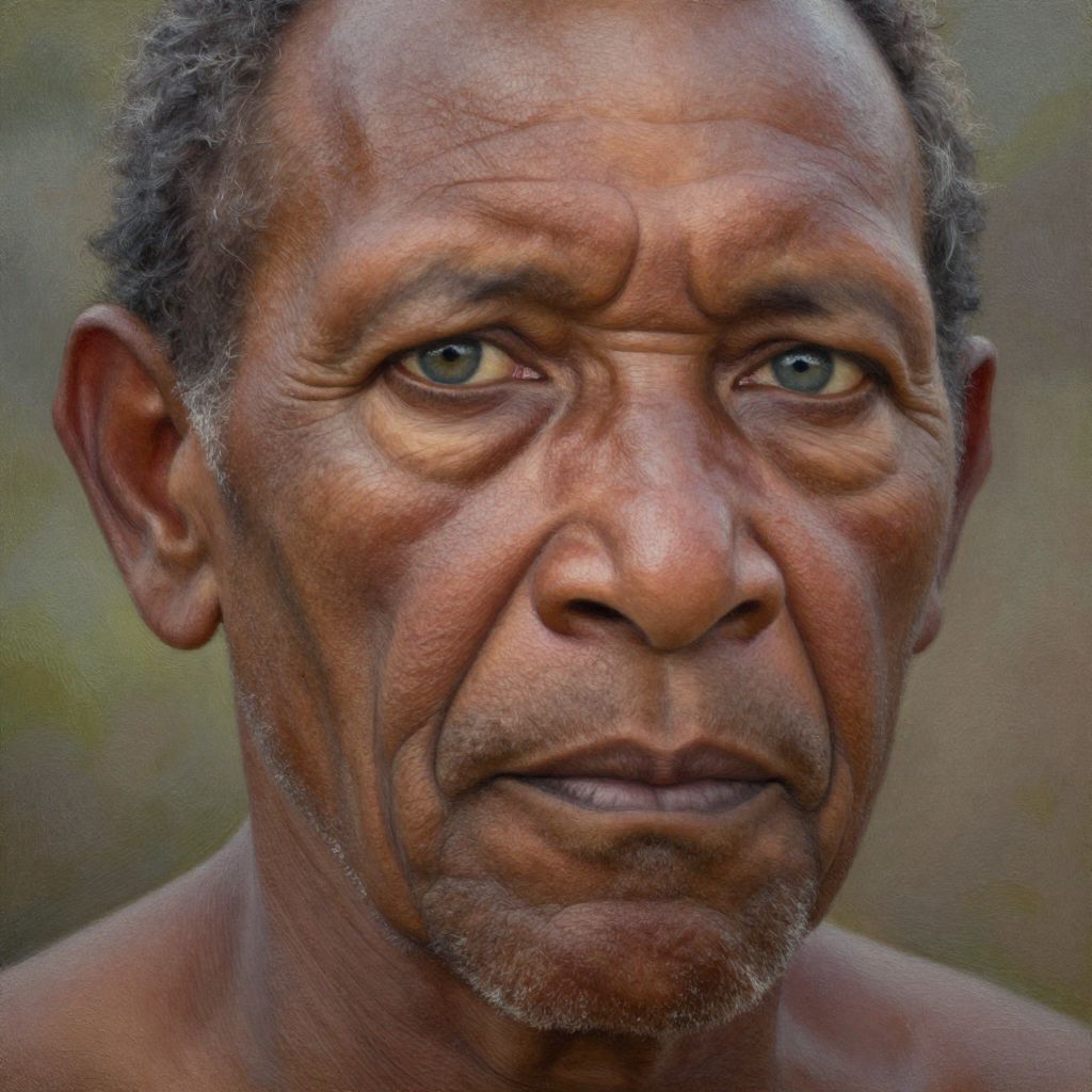 A portrait, styled as a hyper-realistic oil painting, captures the essence of a middle-aged Aboriginal man with hazy blue eyes and a rugged, angular jawline. His gnarled skin tells a story of a life filled with experiences, while his expression conveys a sense of wisdom and introspection. The soft light from above accentuates the deep creases around his eyes, casting gentle shadows on his furrowed brow. The composition offers a unique 'bug's-eye view', focusing on the intricate details of his face as if seen through the eyes of an insect perched near his temple. This perspective emphasizes the depth and texture of his skin, creating an intimate connection to his contemplative demeanor.