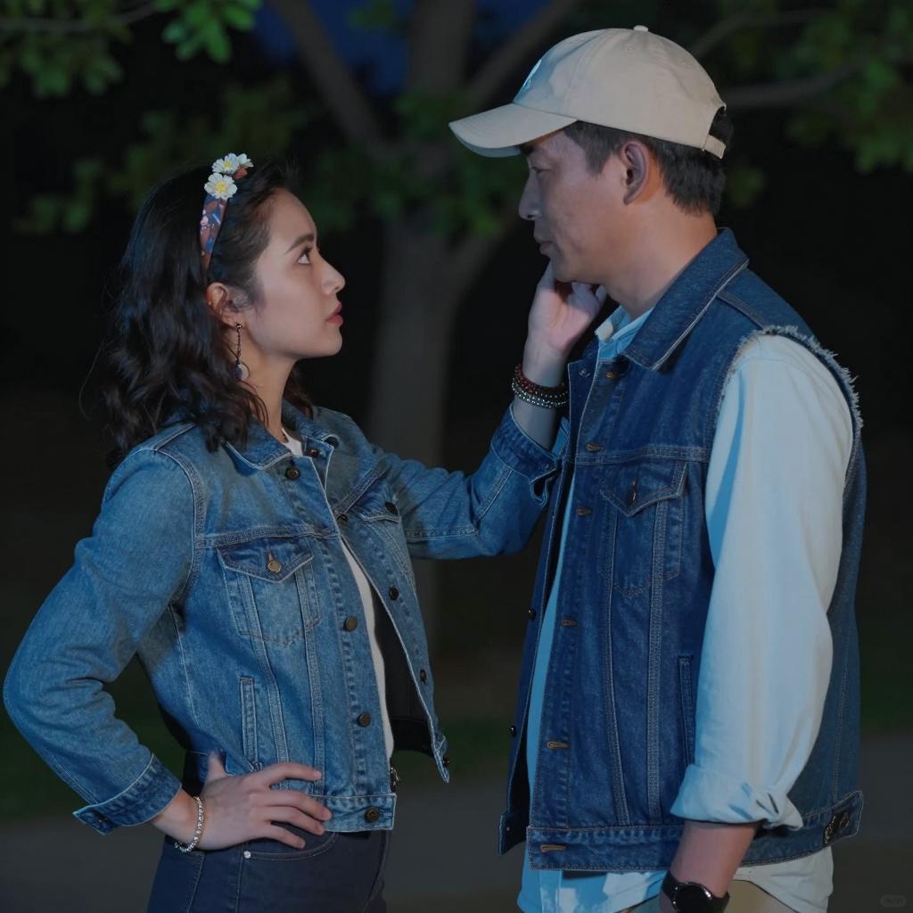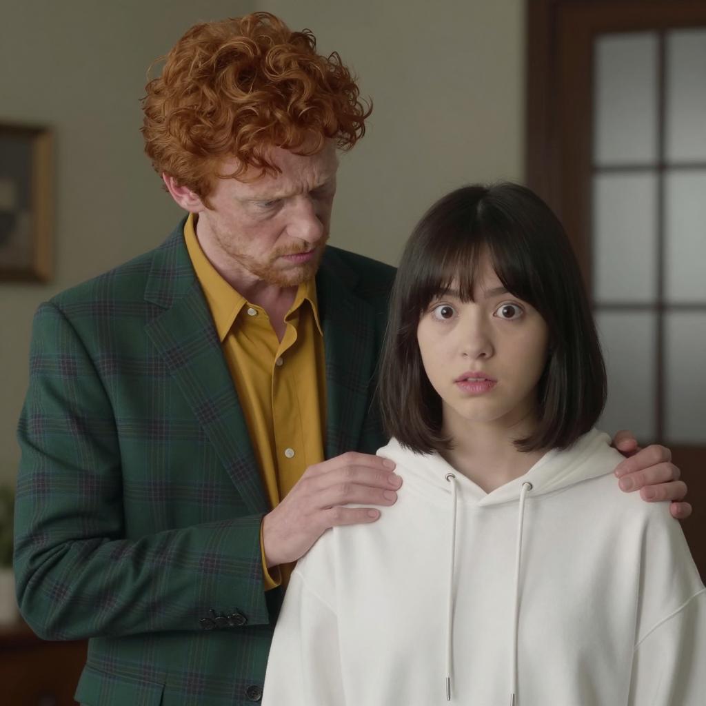 Two people. A man with red hair, green plaid suit, yellow shirt, and intense expression stands behind a girl with black hair, white hoodie, and wide-eyed expression. He touches her shoulder with his right hand. Background includes a dark wall and window.