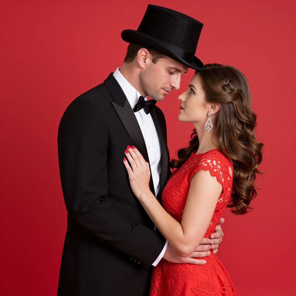 Elegantly dressed couple embracing in a romantic pose against a vibrant red backdrop, the man in a classic black tuxedo and top hat, and the woman in a striking red lace dress with cascading hair and sparkling earrings.