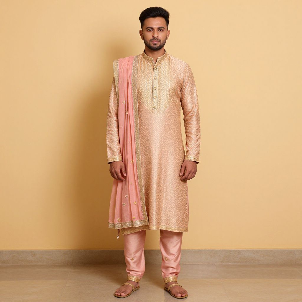 "Wedding Salwar Kurta, a man in a pink and gold indian outfit standing in front of a wall"