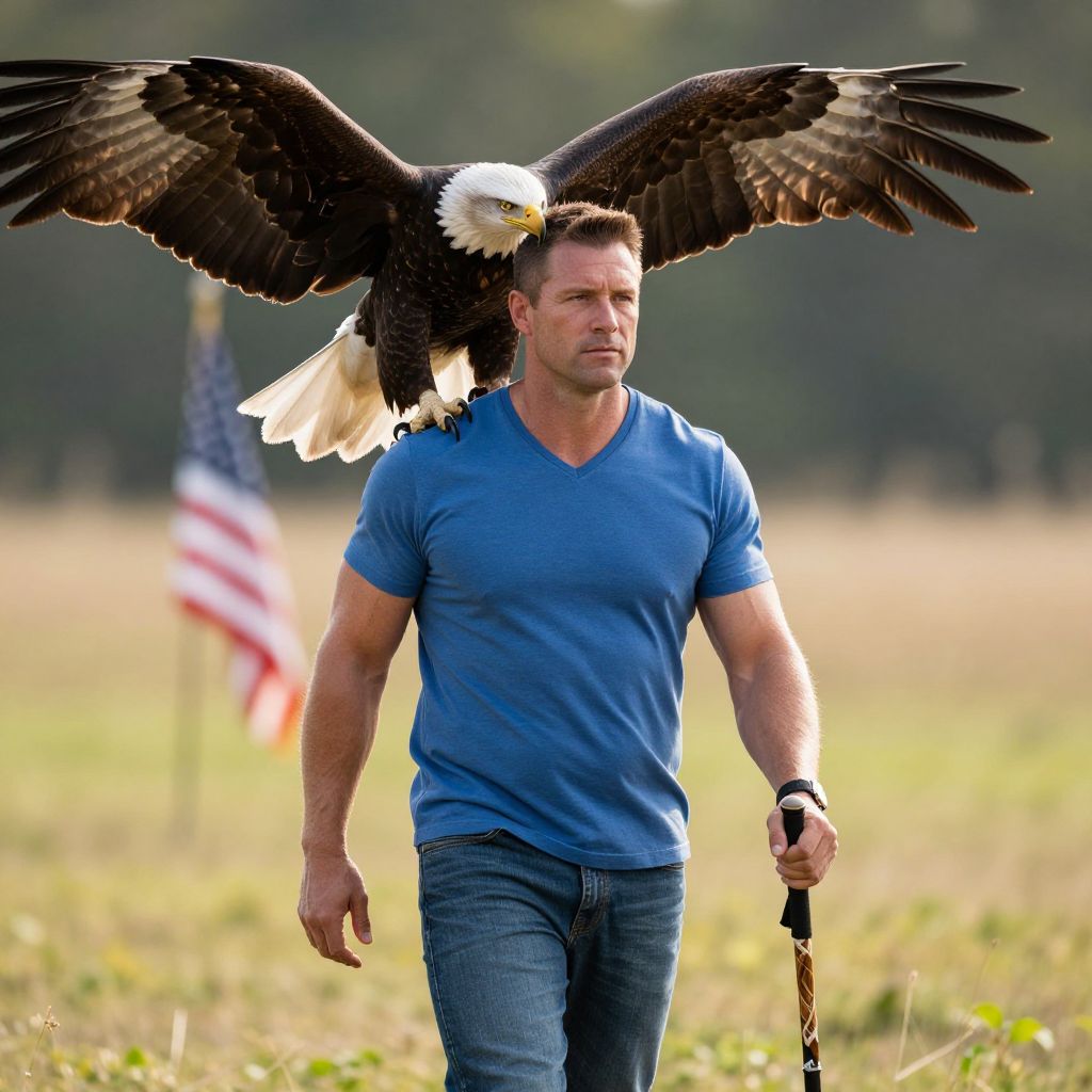 Photograph of a muscular man with short brown hair, wearing a blue V-neck t-shirt and jeans, walking in a grassy field. A large bald eagle with outstretched wings is perched on his right shoulder, looking forward. He holds a walking stick in his left hand. The American flag is visible in the blurred background. Sunlight casts a warm glow, highlighting the eagle's feathers and the man's determined expression.