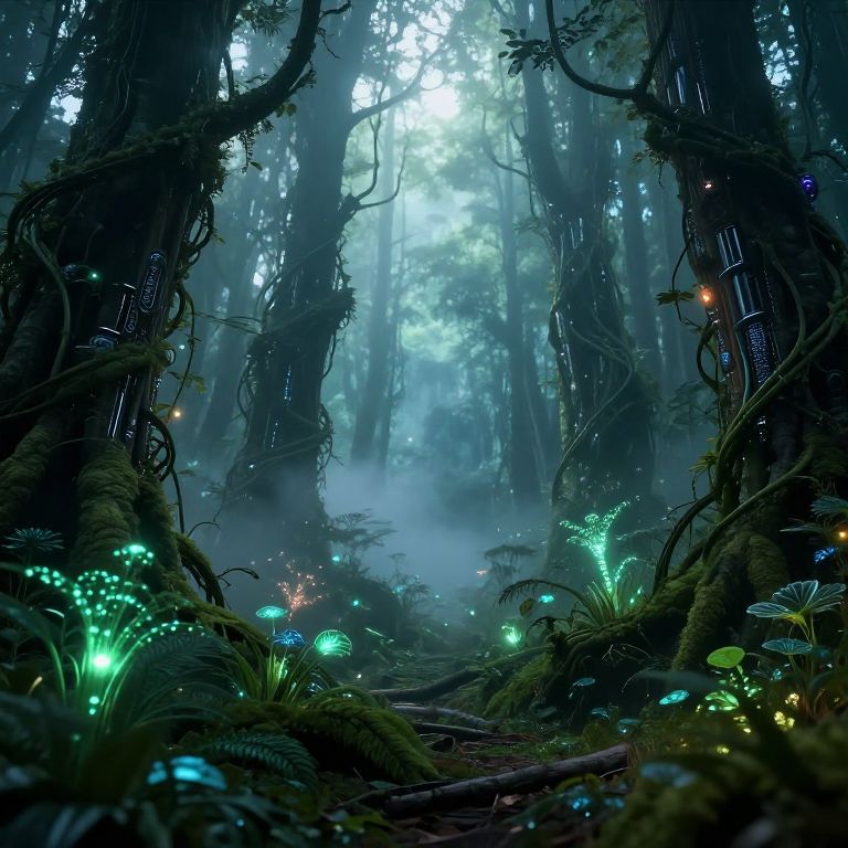 "Evolution Fantasy Concept Art, Deep in the dead forest, a beam of light illuminates a stone dias overgrown with vines and moss.,"