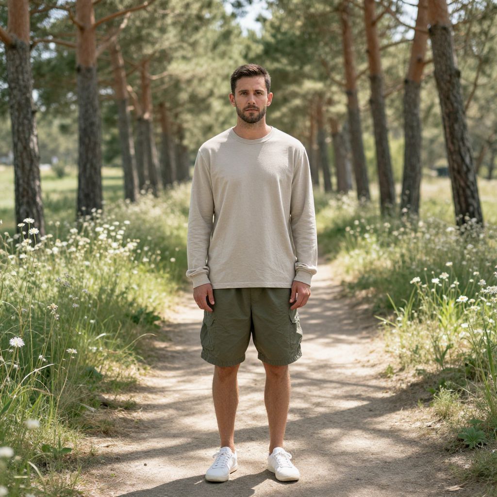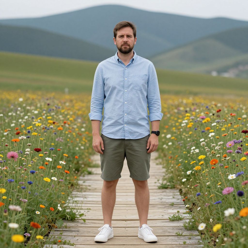 A man, light blue oversized hoodie, beige linen shorts, navy canvas sneakers, summer-ready look, vibrant wildflowers, Holga camera style, relaxed pose, smiling expression, surrounded by buzzing dragonflies.Man has masculine face and piercing eyes