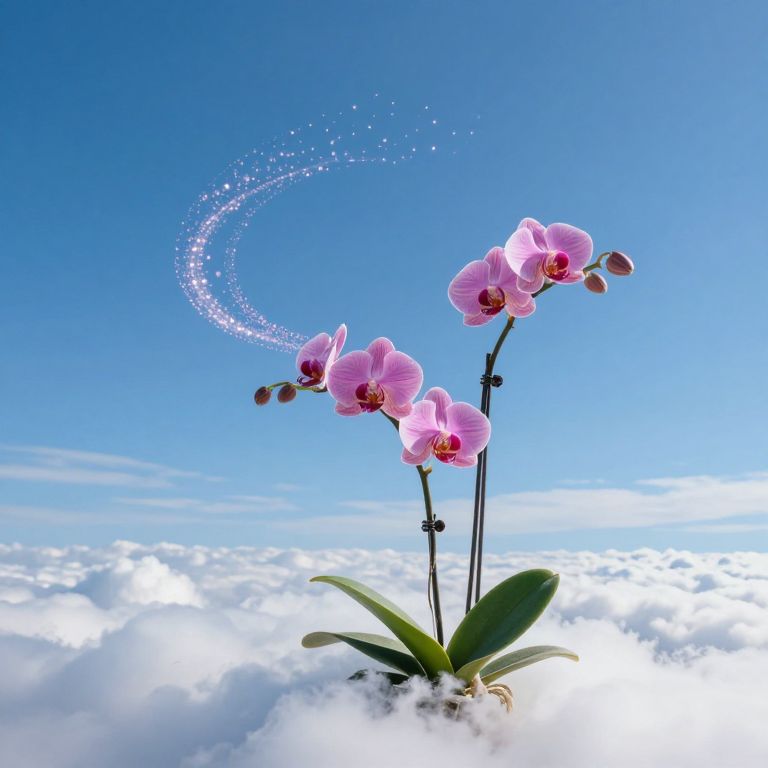 Graceful pink orchids soar through the azure sky, trailing shimmering particles that form ethereal loops above a sea of fluffy white clouds.