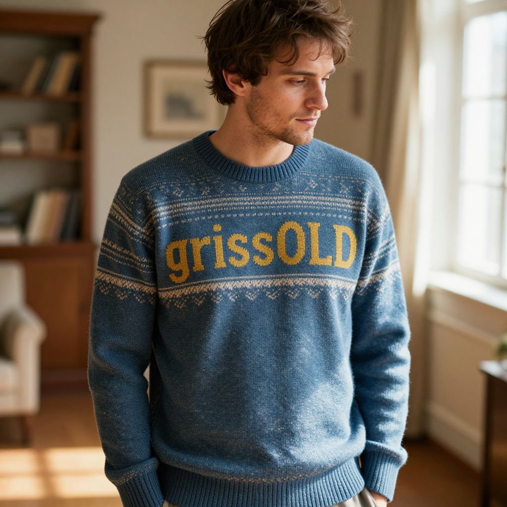 A man with short brown hair, warm and slightly tousled, wearing a cozy blue sweater with a detailed patterned design featuring subtle geometric shapes and soft textures. The front of the sweater prominently displays the word 'grissOLD' in elegant, bold gold lettering. He stands in a cozy, sunlit room with a wooden floor and soft natural light streaming through a window, giving the scene a warm, inviting atmosphere. The overall style is modern and slightly nostalgic, blending casual comfort with a touch of vintage charm.