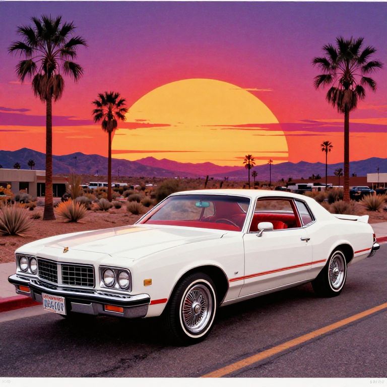 Photograph of a white, classic 1970s Chevrolet sedan parked on a desert road at sunset. The car has chrome accents, a front grille with vertical bars, and a California license plate. The background features a vibrant orange sun setting behind a purple and pink sky, with palm trees and low desert shrubs. The road has yellow and white lines, and there are buildings and mountains in the distance. The image has a vivid, almost hyper-realistic color palette, enhancing the dramatic sunset and car's retro style.