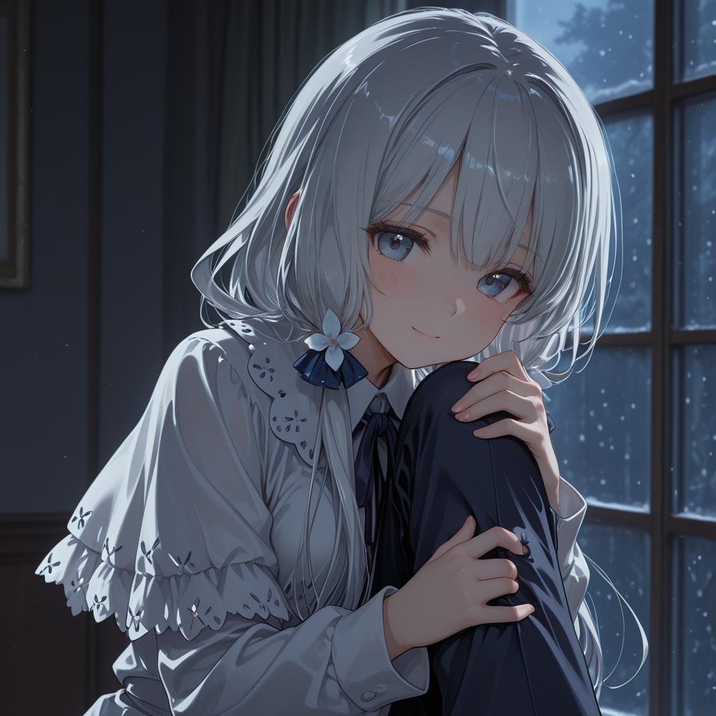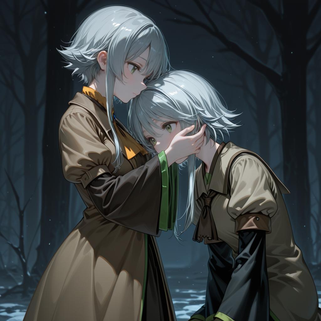 Houlen yabusame, len'en, 1other, grey eyes, grey hair, short hair, short hair with long locks, brown coat, short over long sleeves, puffy short sleeves, wide sleeves, ascot, by artist ningen mame, dark_illustrious