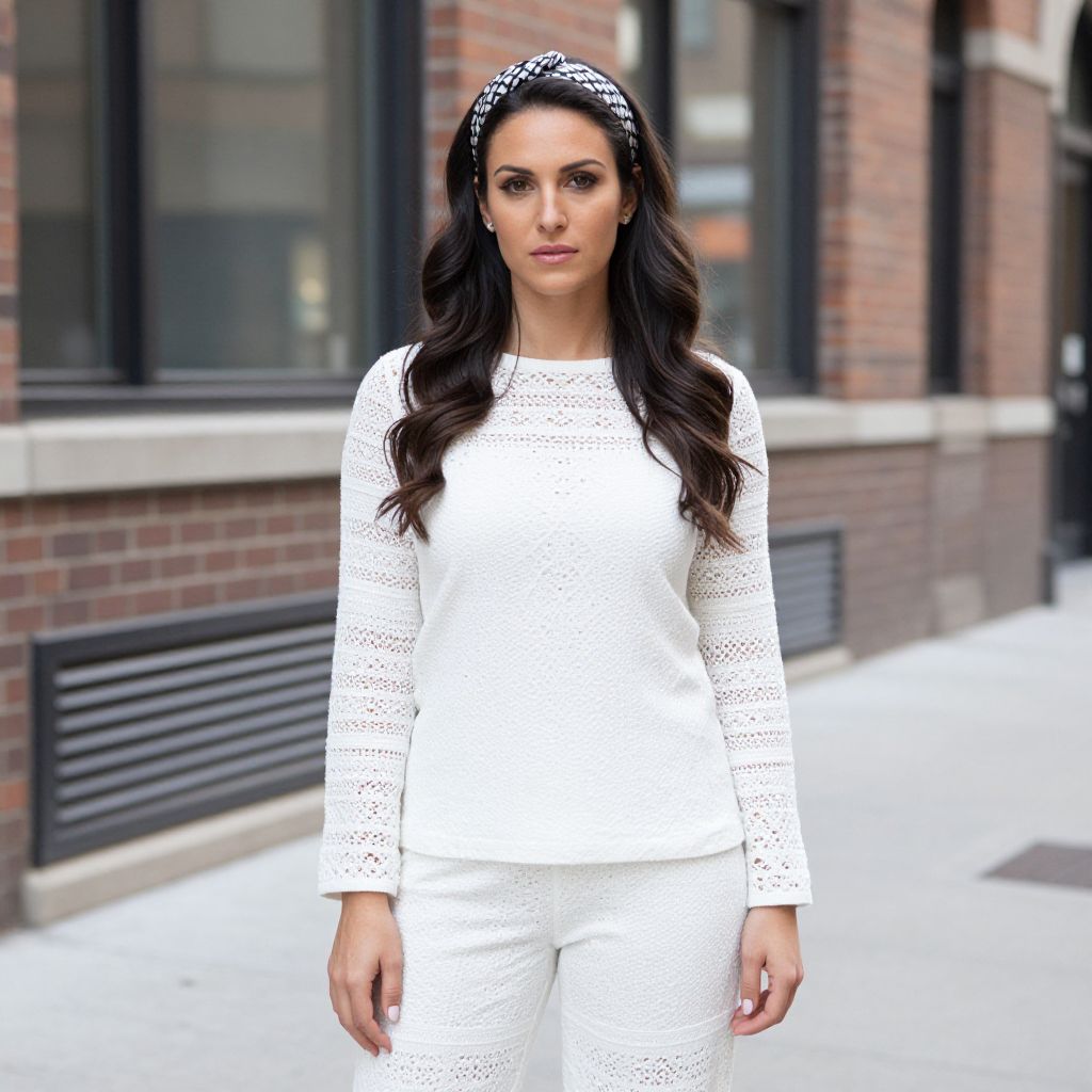 Photograph of a confident woman standing on a city street. She has long, wavy dark brown hair, wearing a white, long-sleeve, lace-patterned top and matching pants. A black and white patterned headband adorns her hair. She's looking straight at the camera with a neutral expression. The background features a brick building with large windows and a metal vent. The sidewalk is clean and gray.