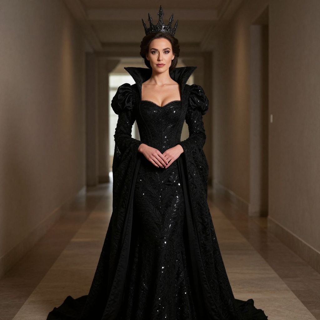Photograph of a tall, slender woman with pale skin and dark hair styled in an updo, wearing a black, long-sleeved, strapless gown adorned with intricate beadwork and large, ruffled shoulders. She also wears a black crown with small, pointed spikes. Her hands are delicately clasped in front of her. She stands in a dimly lit, long, narrow hallway with brown tiled flooring and beige walls. The background is slightly blurred, highlighting her regal, gothic-inspired attire. The lighting casts soft shadows, adding depth to the image.