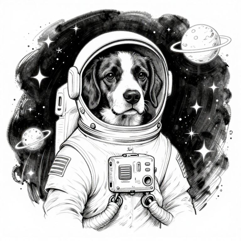 A black and white ink sketch of a dog wearing an astronaut suit, set against a cosmic background with stars and planets.