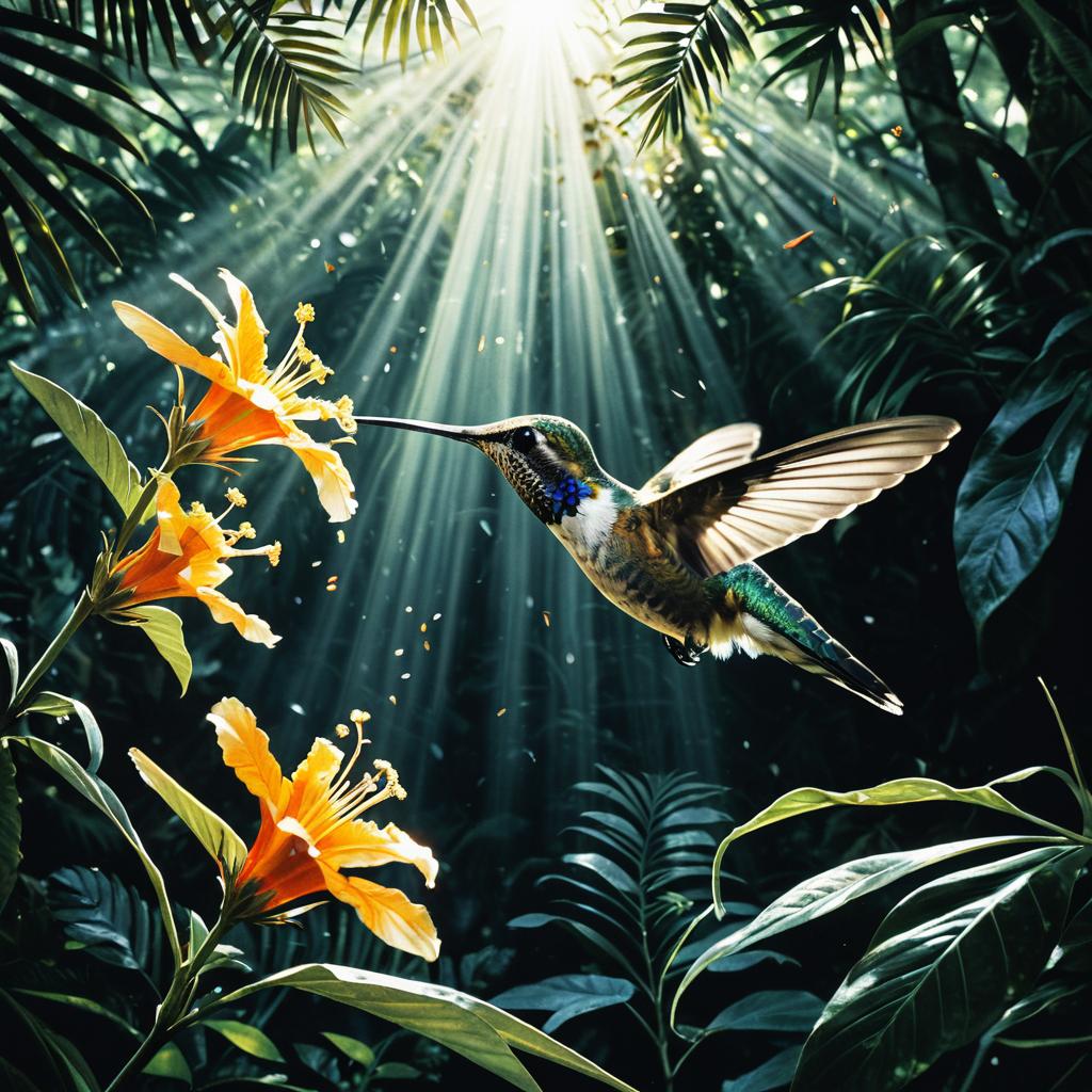 Digital artwork of a hummingbird feeding on nectar in an exotic rainforest. X-ray effect highlights the fine bone structures and luminous textures of the bird, while sunbeams pierce through dense foliage, creating a dramatic and ethereal atmosphere.