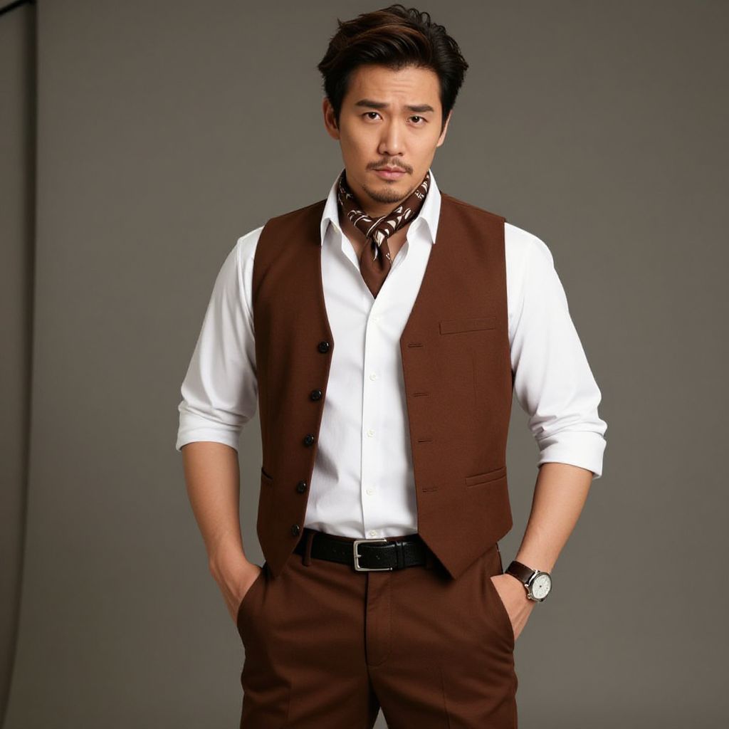 "man vest fashion costume, 1boy, male focus, solo, watch, wristwatch, brown pants, white shirt, pants, shirt, belt, vest, black belt, facial hair, realistic, hands in pockets, brown vest, scarf, looking at viewer, standing, cowboy shot, asian, brown hair, black hair, open clothes, closed mouth, jacket, mustache Realistic photo of casual sexy person with pretty face"
