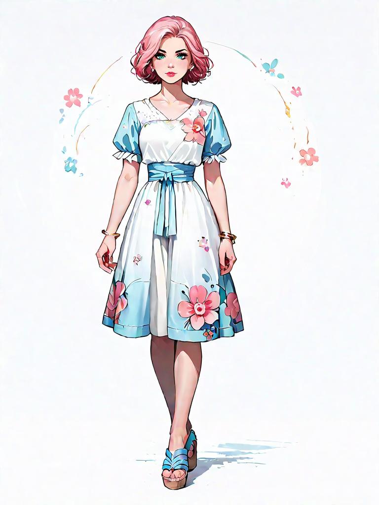 1girl, source_comics, realistic face, full body shot, Woman, boho chic, floral maxi dress in pastel shades, cold shoulder design with thin straps, sweetheart neckline, short flutter sleeves, fitted waist, full-length skirt with front slit, white background.