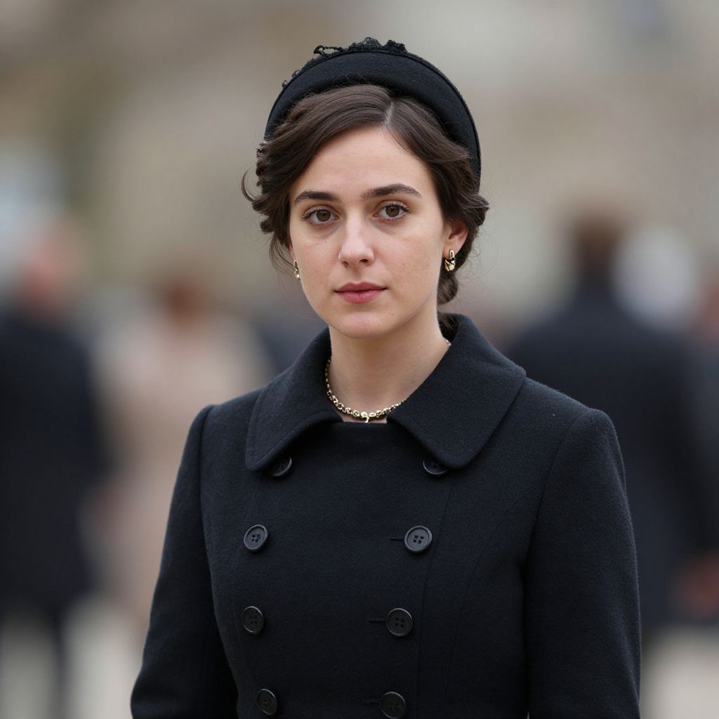 Photograph of a young woman with fair skin, dark brown short wavy hair, and brown eyes, wearing a black double-breasted coat with large buttons, a black beret, and a delicate silver necklace. She has small, simple gold earrings. The background is blurred with indistinct people and buildings, suggesting an urban outdoor setting. The woman's expression is neutral, and the lighting is natural, highlighting her elegant, minimalist style. The overall color palette is dark and muted, focusing on black and silver.