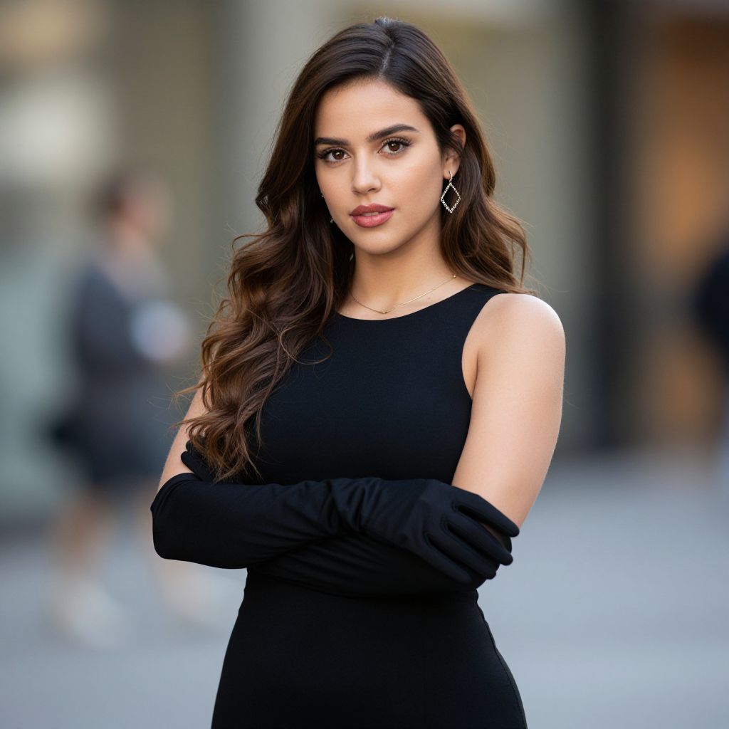 Photograph of a young woman with long, wavy brown hair and fair skin, standing in an urban outdoor setting. She wears a sleeveless, form-fitting black dress and long black gloves, with silver diamond-shaped earrings. Her expression is confident, with slightly parted pink lips and dark, defined eyebrows. The background is blurred, featuring indistinct figures and a mix of grey and brown tones, suggesting a city street. The image is sharply focused on her, highlighting her smooth skin and the texture of her dress and gloves.