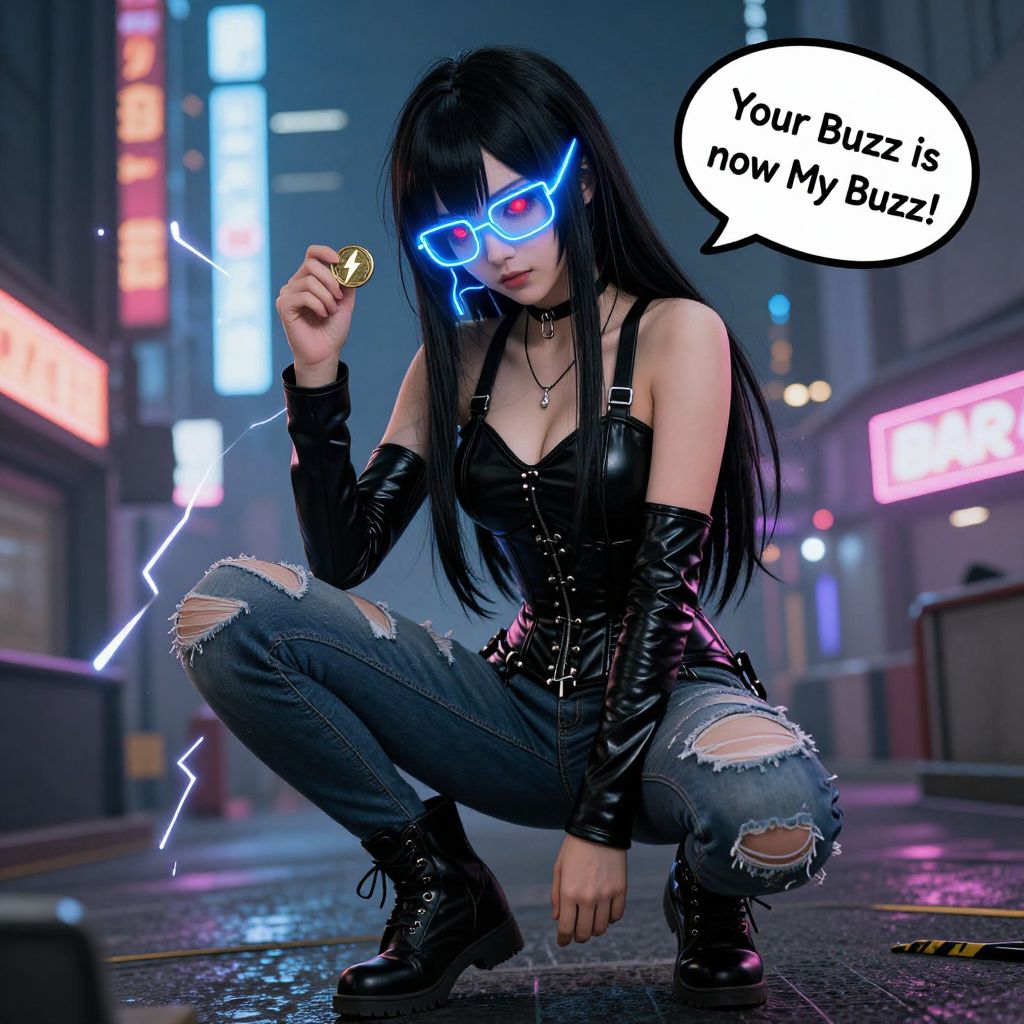 Digital artwork of a dark-haired woman with glowing blue cat-eye glasses, squatting in a neon-lit, cyberpunk city street. She wears a black leather corset, ripped jeans, and black boots, holding a gold coin in her right hand. Her expression is intense, with a speech bubble saying, "Your Buzz is How My Biz is." The background features colorful, illuminated signs and a wet, reflective street surface. The overall style is futuristic and edgy, with vibrant colors and sharp contrasts. The artist's style blends realism with a comic book aesthetic.
