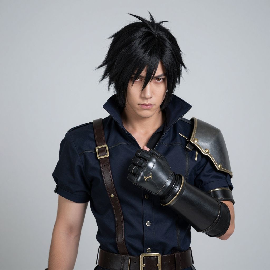 A man is dressed in a highly detailed Zack Fair cosplay costume, featuring spiked black hair, a dark navy outfit with gold accents, leather straps, and armored gauntlets. The image captures a realistic and intense portrayal of the character from the Final Fantasy series, emphasizing the craftsmanship of the costume and the cosplayer's serious expression.
