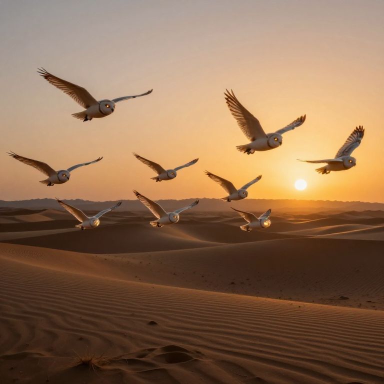 Glowing clockwork owls soar gracefully through a desert sky at sunset, their golden wings reflecting the warm hues as they migrate silently above rippling sand dunes.