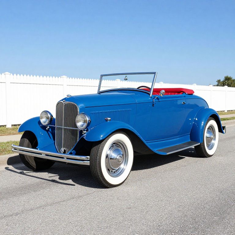 Shiny blue 1929 Ford Roadster parked gracefully on a paved road, showcasing its classic design with polished chrome accents, whitewall tires, and a vibrant red interior, set against a backdrop of a clear blue sky and a white picket fence.