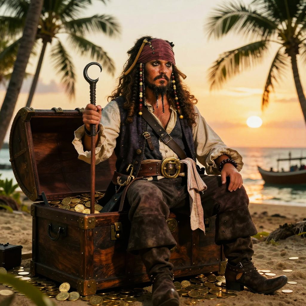 Fat pirate swashbuckler with a bushy beard and a hook hand, sitting on an ancient wooden treasure chest filled with gold coins, tropical island background with palm trees and sunset, cinematic atmosphere and intricate details.