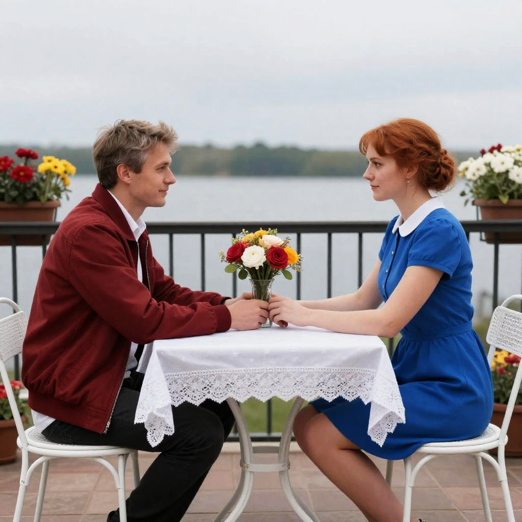 Photograph of a couple dining outdoors. Man in red jacket, white shirt, and black pants, sitting, looking at woman. Woman in blue dress, white collar, standing, holding hands over table. Table with lace tablecloth, flowers, glass vase. White metal chairs, tile floor, railing, and lake in background. Overcast sky, flowers in pots on railing. Man's short grey hair, woman's red hair in an updo. Woman's focused expression, man's slight smile.