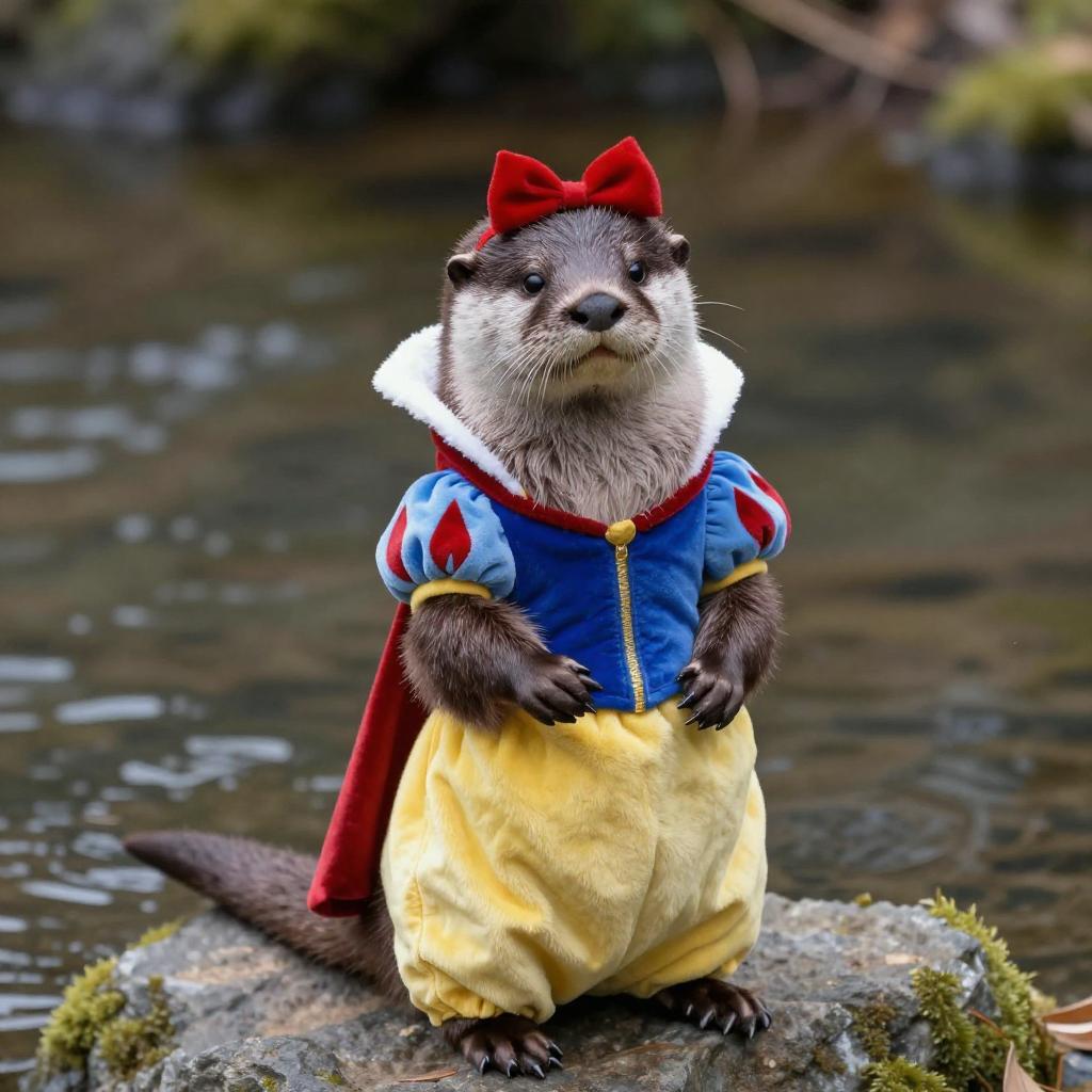 Realistic photo. River otter dressed as a Snow White posing for an image, playful and storybook. realistic photo
