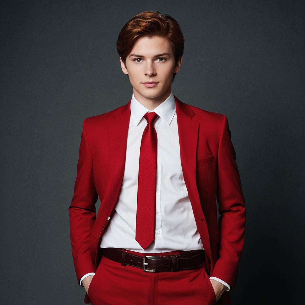 Red suit hero costume,1boy, solo, male focus, necktie, suit, formal, realistic, jacket, shirt, red pants, white shirt, belt, pants, collared shirt, red suit, standing, red necktie, red jacket, arms at sides, brown hair, closed mouth, long sleeves