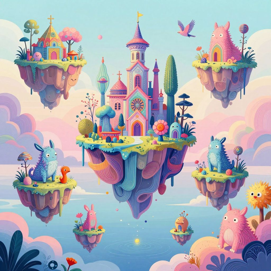 Drawing inspo generator themed surreal landscape with floating islands, vibrant pastel colors, intricate line art, whimsical creatures, and dynamic lighting creating an imaginative world bursting with creativity and artistic energy.
