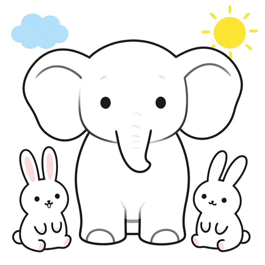 Easy cartoon coloring pages featuring oversized friendly animals like elephants and rabbits, simple lines and large empty spaces for children to fill with vibrant colors, playful background with clouds and sunshine, bright and cheerful style.