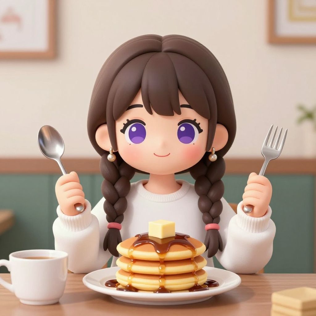 8k, 4k, nsfw, chibi, food, smile, long hair, braid, indoors, brown hair, earrings, jewelry, holding, looking at viewer, 1girl, blush, twin braids, pancake, plate, spoon, bangs, holding spoon, fork, long sleeves, white sweater, sweater, solo, closed mouth, shirt, purple eyes, syrup, upper body, cup, white shirt, holding fork, solo focus, sitting, hands up, butter, table, pov across table