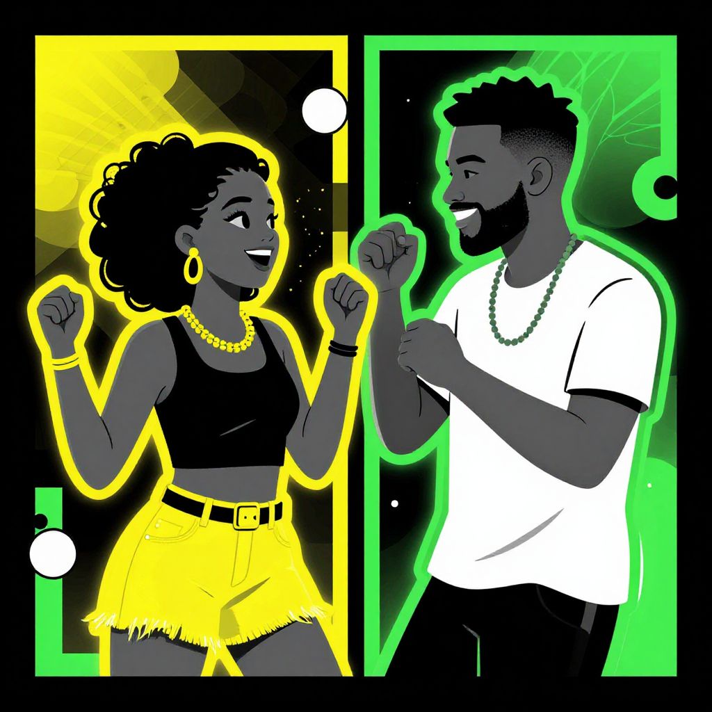 Digital illustration of a smiling black couple dancing; woman in yellow shorts and black top, man in white tee, both glowing.