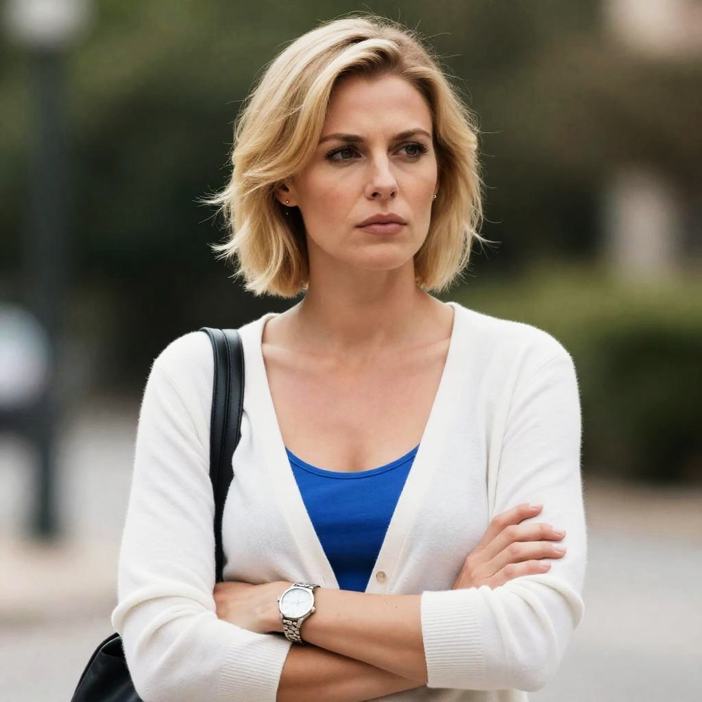 Blonde woman with fair skin, wearing a red winter coat with a fur-lined hood, extends a black-gloved hand, pointing a gun. Intense expression. Snow-covered ground, rustic wooden shed, and an old gray snow blower in the background. Photorealistic.