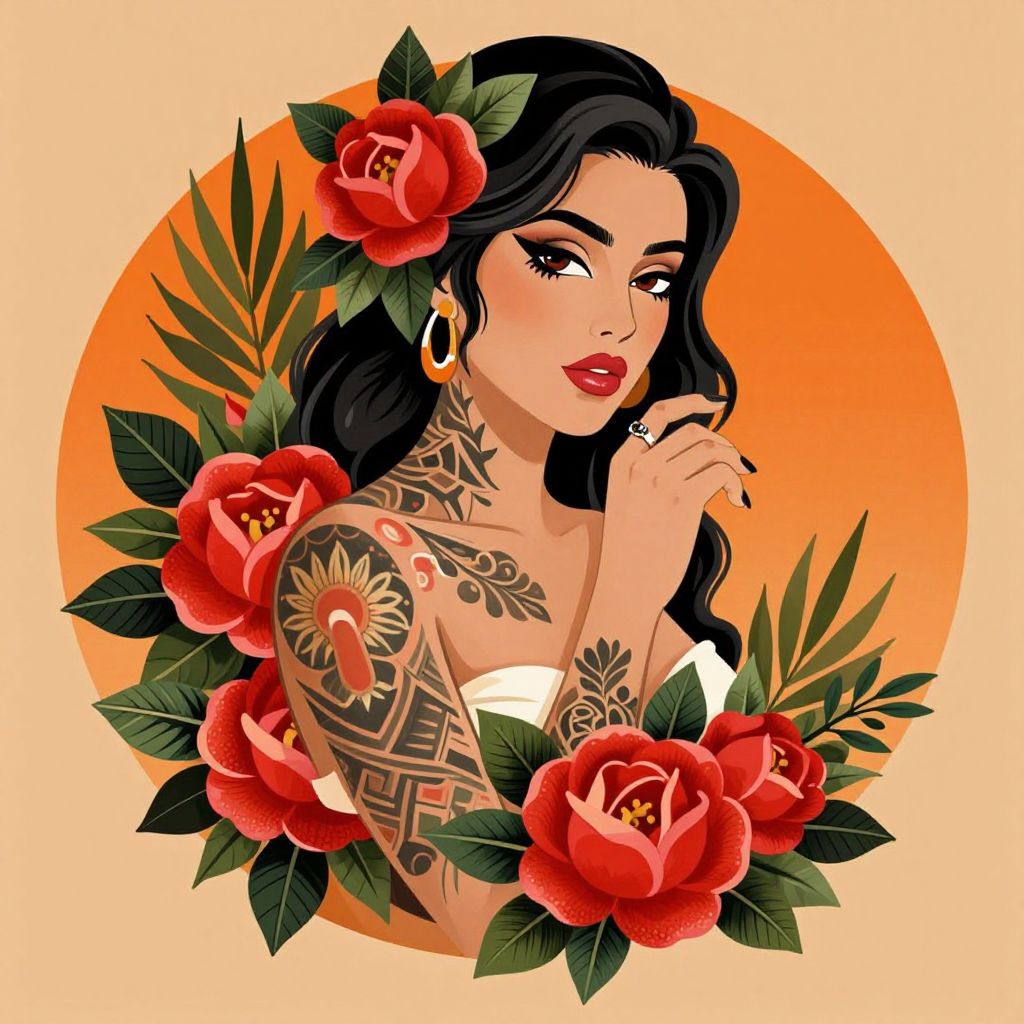 Digital illustration of a tattooed woman with long, wavy black hair and fair skin, set against an orange circular background. She has striking red lips, large hoop earrings, and is gazing seductively to the side with one hand near her chin. She wears a black strapless top, showcasing intricate floral and geometric tattoos on her left arm and shoulder. Bold red roses and green leaves frame her below, adding vibrant contrast. The style is reminiscent of modern tattoo art with a pop art influence. The overall composition is both striking and elegant.