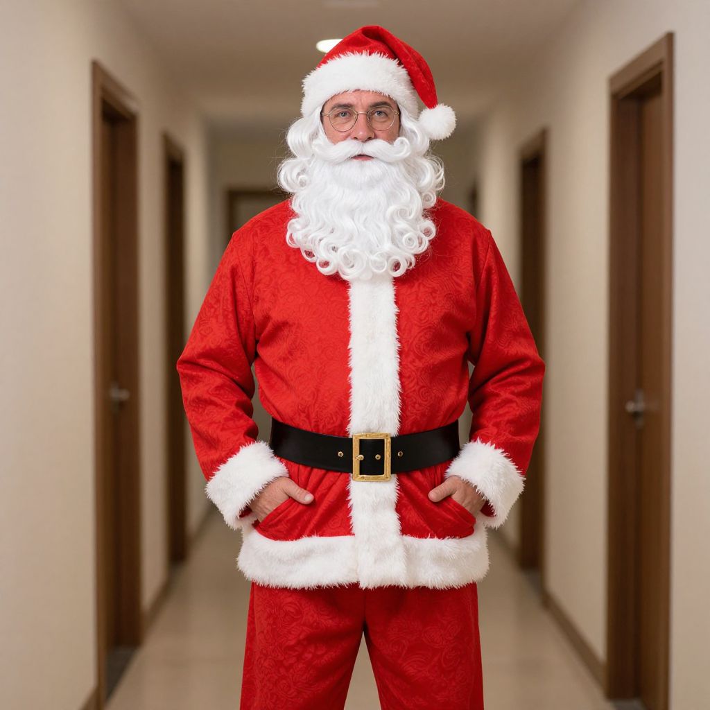 A photograph of a middle-aged man with glasses, wearing a full Santa Claus outfit. He has a large, curly white beard and a red Santa hat with a white trim. His red velvet suit is trimmed with white fur and has a black belt with a gold buckle. He stands confidently in a long, narrow, white-walled hallway with brown doors on both sides. His hands are in his pants pockets, and he gazes directly at the camera. The lighting is even, highlighting the festive colors of his attire.