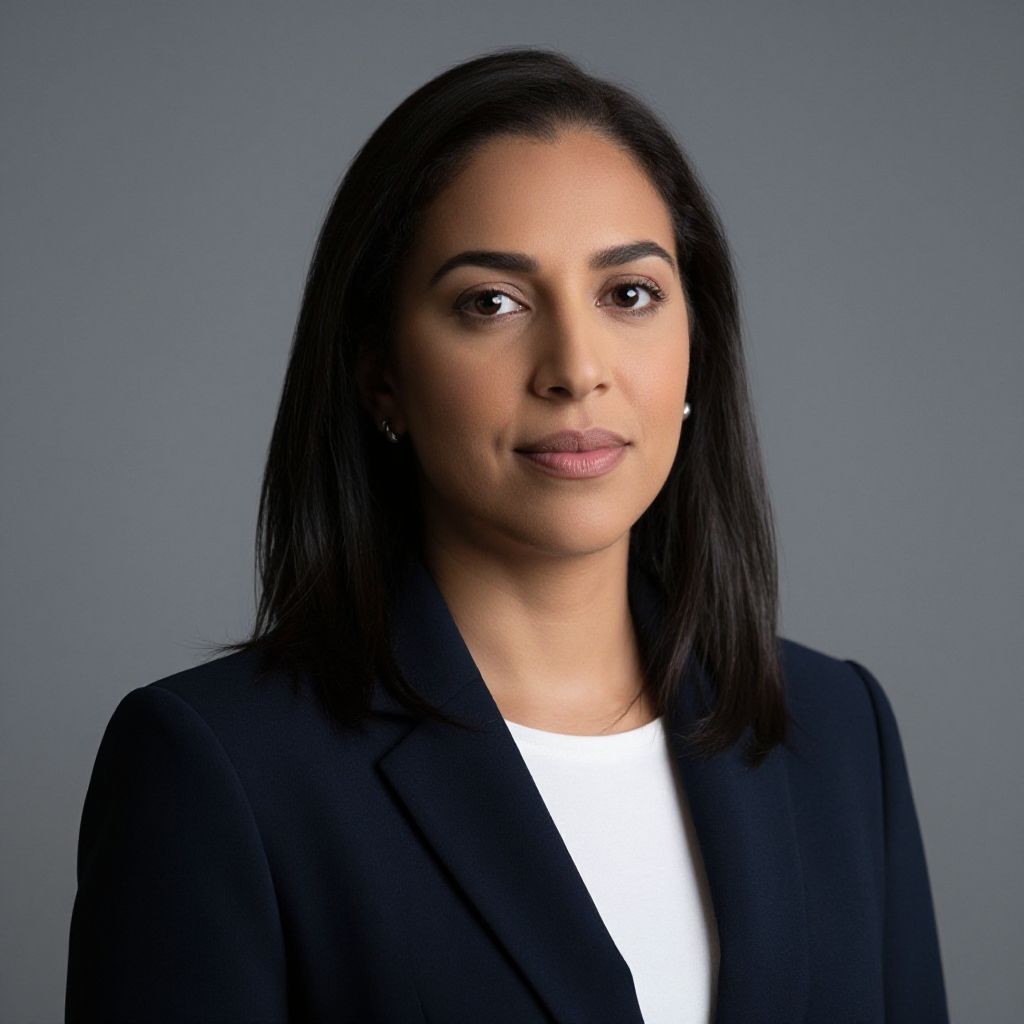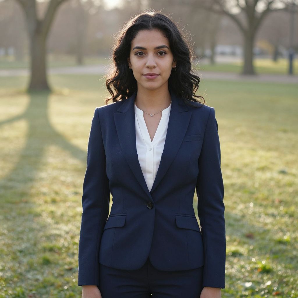 A young woman with wavy black hair and a kind, thoughtful expression wearing a tailored navy blue fitted jacket over a white blouse, standing in a quiet park during early morning with dew on the grass and golden sunlight casting long shadows