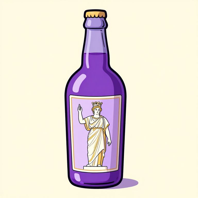 Digital illustration of a purple glass bottle with a gold cap, featuring a white and yellow classical statue of a robed figure on the label, set against